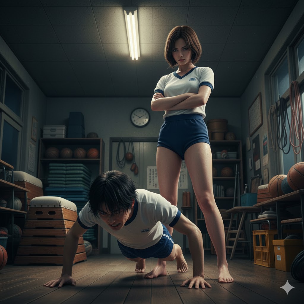 「さあ、じゃあ今日の放課後、体育用具室で待ってるわね。もちろん、ちゃんと体操服に着替えてくるのよ。遅れたら、容赦しないから」ミキは、ニヤリと唇の端を吊り上げた。その表情は、彼に屈服を強いる女王のようだった。